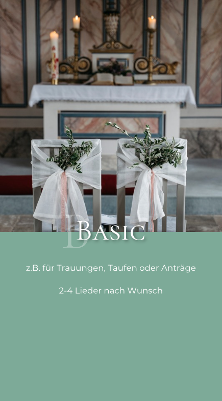 Ihr möchtet mehr als 4 Songs während der Trauung, ich soll die Kirchenlieder zusätzlich am Klavier begleiten oder ihr möchtet auch in den Repertoire-Sets für die Hintergrundmusik ganz bestimmte Lieder haben? Gerne kann ich auf eure Wünsche eingehen.